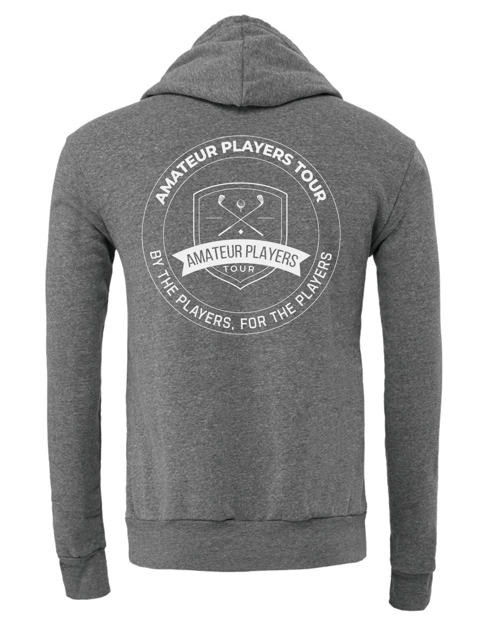 Heather Navy hooded sweatshirt with white drawstrings. Decorated with full logo on the back with Amateur Players Tour on the front left chest. Light to Mid-weight and very soft. You will want this sweatshirt!